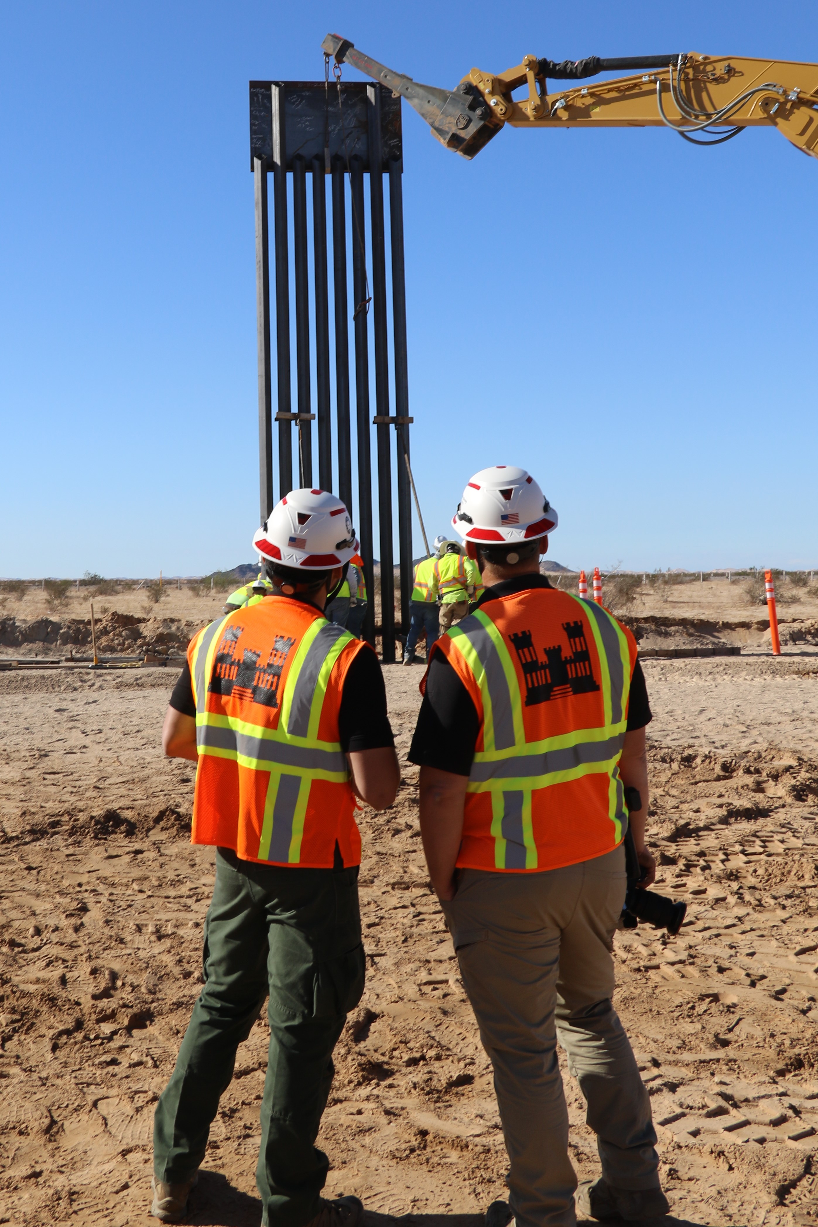 U.S. Army Corps of Engineers South Pacific Border Task Force install the first border barrier panel at the BMGR-1 project site near Yuma, Arizona, Oct. 15. USACE is replacing permanent border barriers along the southern border of the U.S. at the direction of the U.S. Army by the Secretary of War, in response to the presidential national emergency declaration dated Jan. 20, 2025, authorizing the use of Section 2803 of Title 10, U.S. Code. (Photo by Robert DeDeaux USACE PAO)